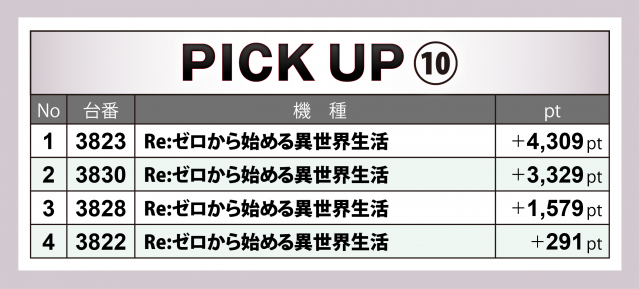 惜しくも合計ptでは5桁を逃したが『Re:ゼロから始める異世界生活』8台では半数がプラス台となり上位2台が+4千超&+3千超を記録、平均ptは4桁を達成した。