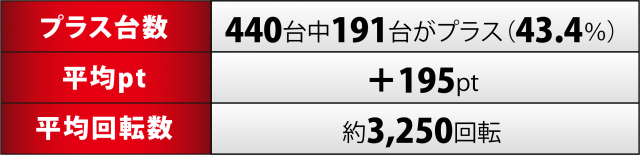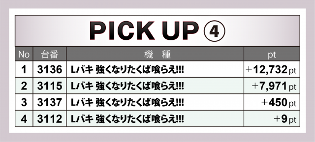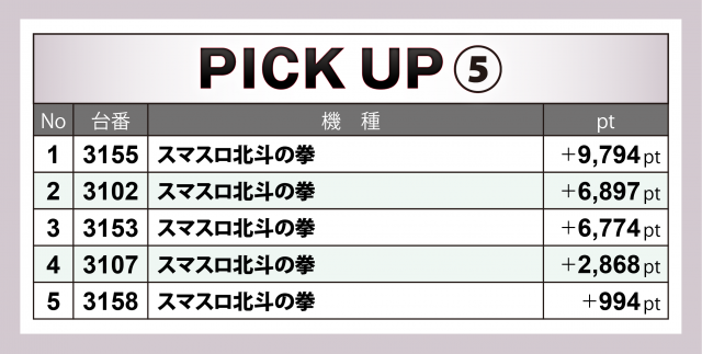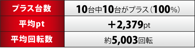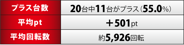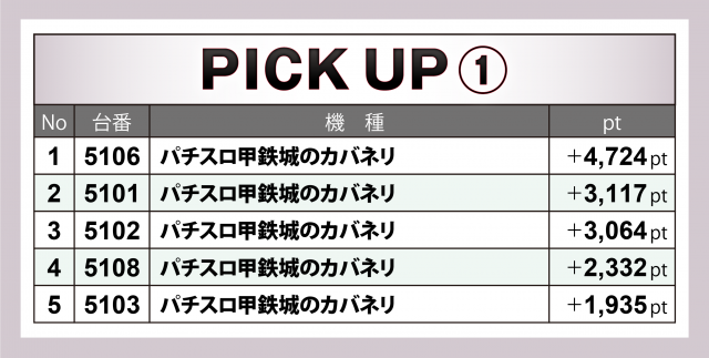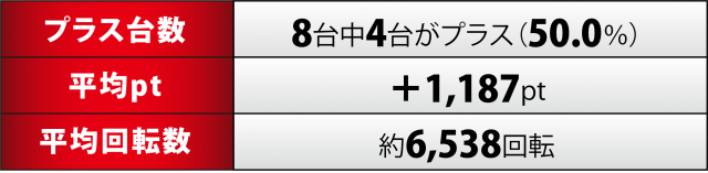 前日は全台プラスとなった上に合計pt数でも当日の上位機種にランクイン、この日は設置を1台増やしたが、オールプラスを維持し優秀機種ナンバー3の座を射止めた。しかも、平均pt数では前の日を上回る2千台の優秀さをマーク。また、ポイント数+4千超となった5106番台を始めに全ての台が好況にあったようだ。