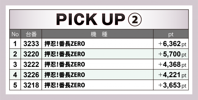 最初は合計ptで+3万オーバーを記録した『押忍!番長ZERO』20台をピックアップ。好調トップ5では+6千超&+5千超が1台ずつ、+4千超が2台というハイレベルで結んだ。