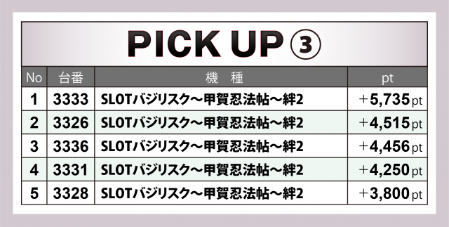 『番長ZERO』と並ぶベテランマシンの『SLOTバジリスク~甲賀忍法帖~絆2』20台も合計pt数で+3万オーバーを達成、上位5台は+5千超×1・+4千クラス×4という結果に。