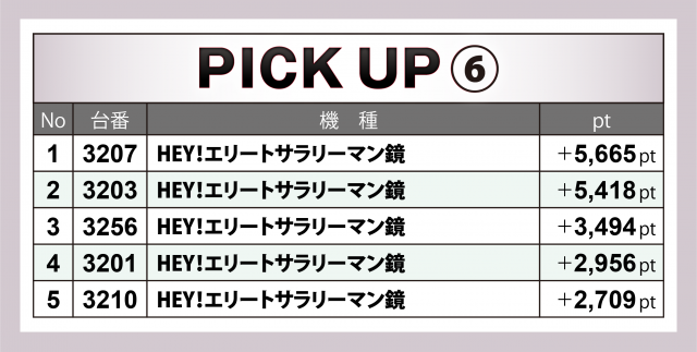 設置20台の『HEY!エリートサラリーマン鏡』も合計pt数で+1万オーバーを達成、ツートップが+5千超という成績を収めた。