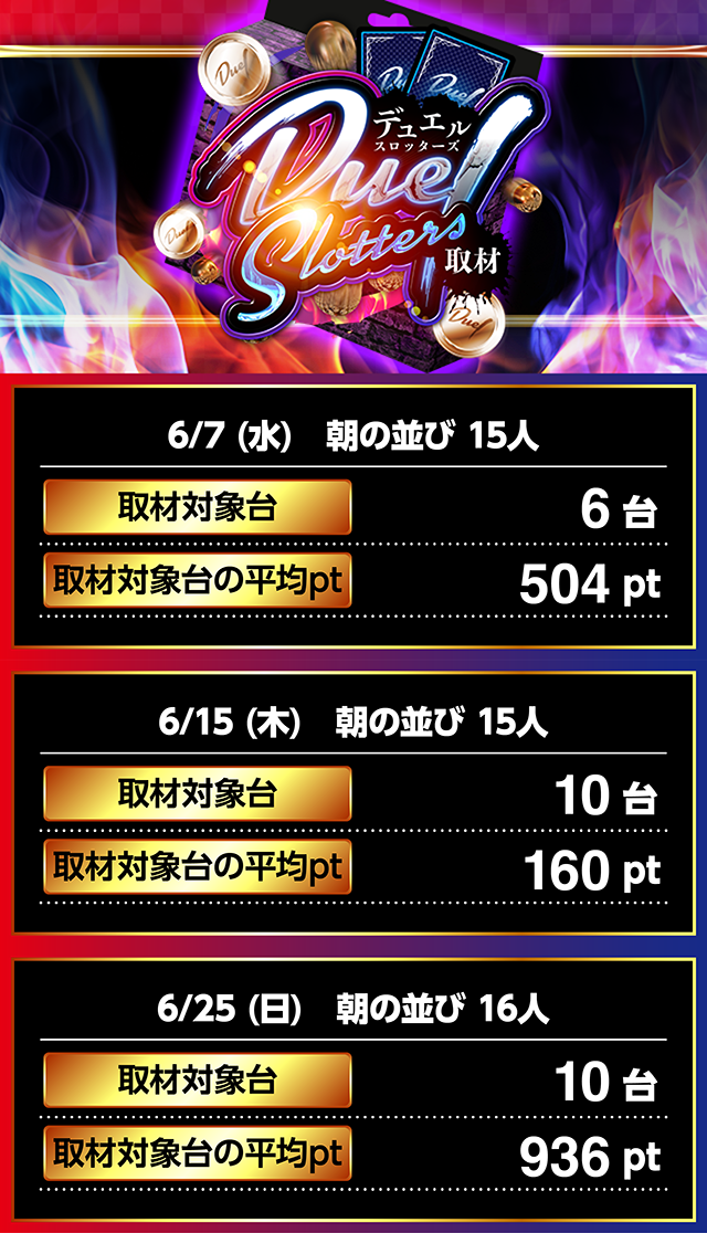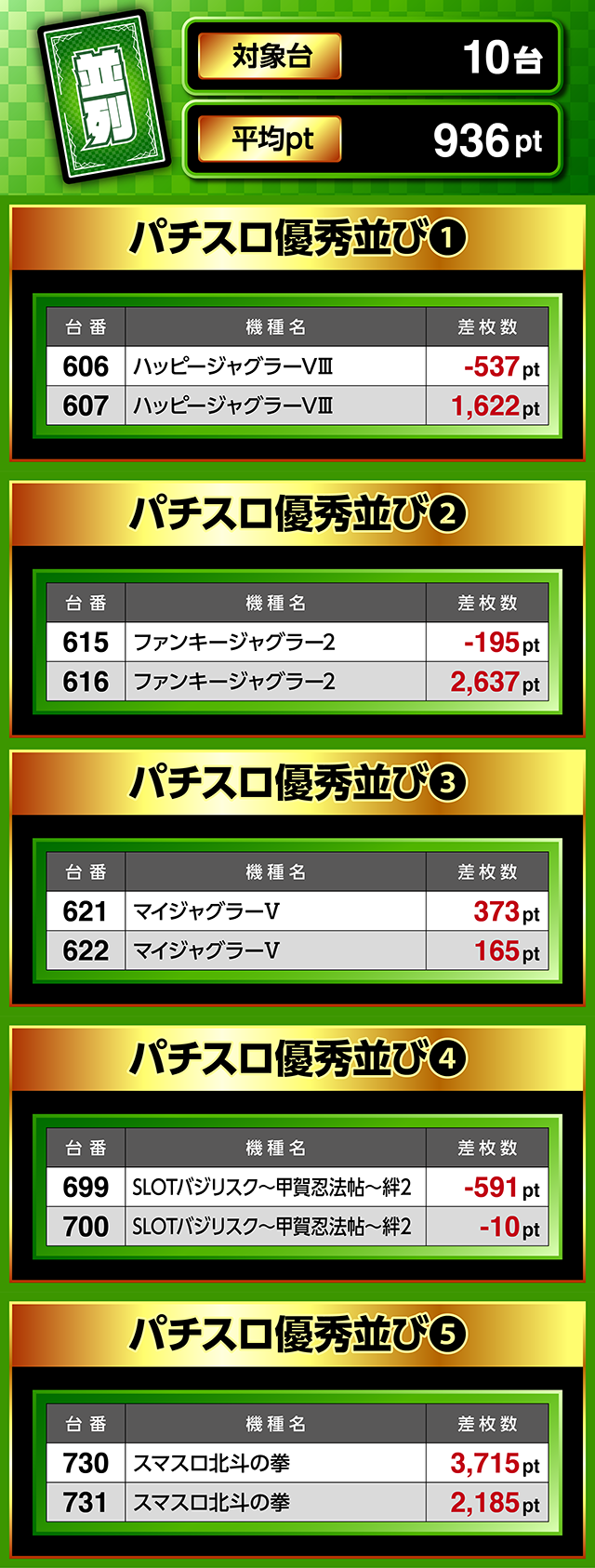 607番台は1,622pt、616番台は2,637ptと、「ハッピージャグラーVⅢ」と「ファンキージャグラー2」にも注目の並びアリ。