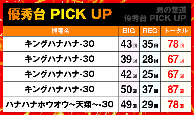「キングハナハナ-30」と「ハナハナホウオウ~天翔~-30」から、ボーナス回数60回以上の5台を厳選。