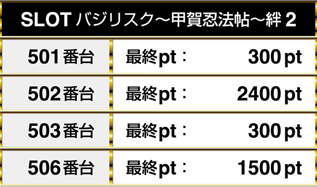 6台設置の『SLOTバジリスク~甲賀忍法帖~絆2』は4台がプラスptを記録し、502番台が2400ptとなった。