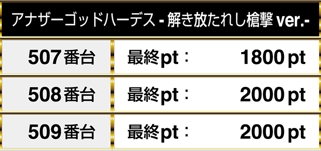 『アナザーゴッドハーデス-解き放たれし槍撃ver.-』は3台が1000pt以上となり、508番台と509番台が2000pt!!