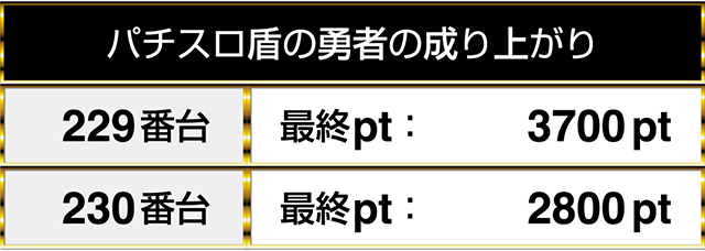 『パチスロ盾の勇者の成り上がり』の229番台は3700pt、230番台も2800ptを記録した。