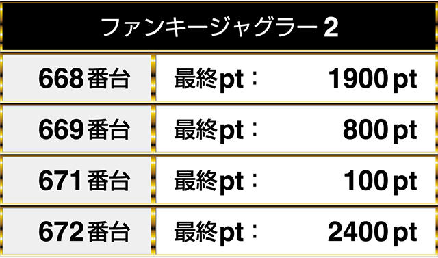 『ファンキージャグラー2』は5台中4台がプラスptを記録した。