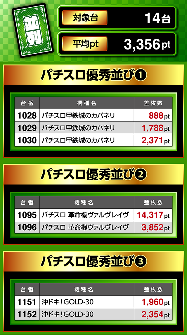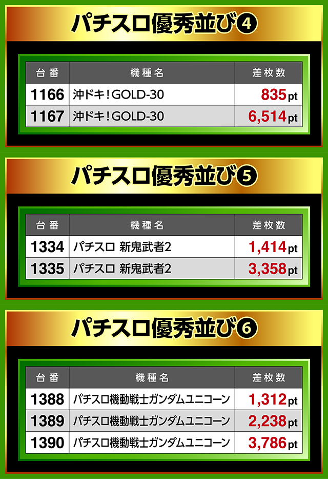 1388番台から1390番台までの「パチスロ機動戦士ガンダムユニコーン」が並んで1,300pt以上を記録し、1390番台は3,700ptオーバー。