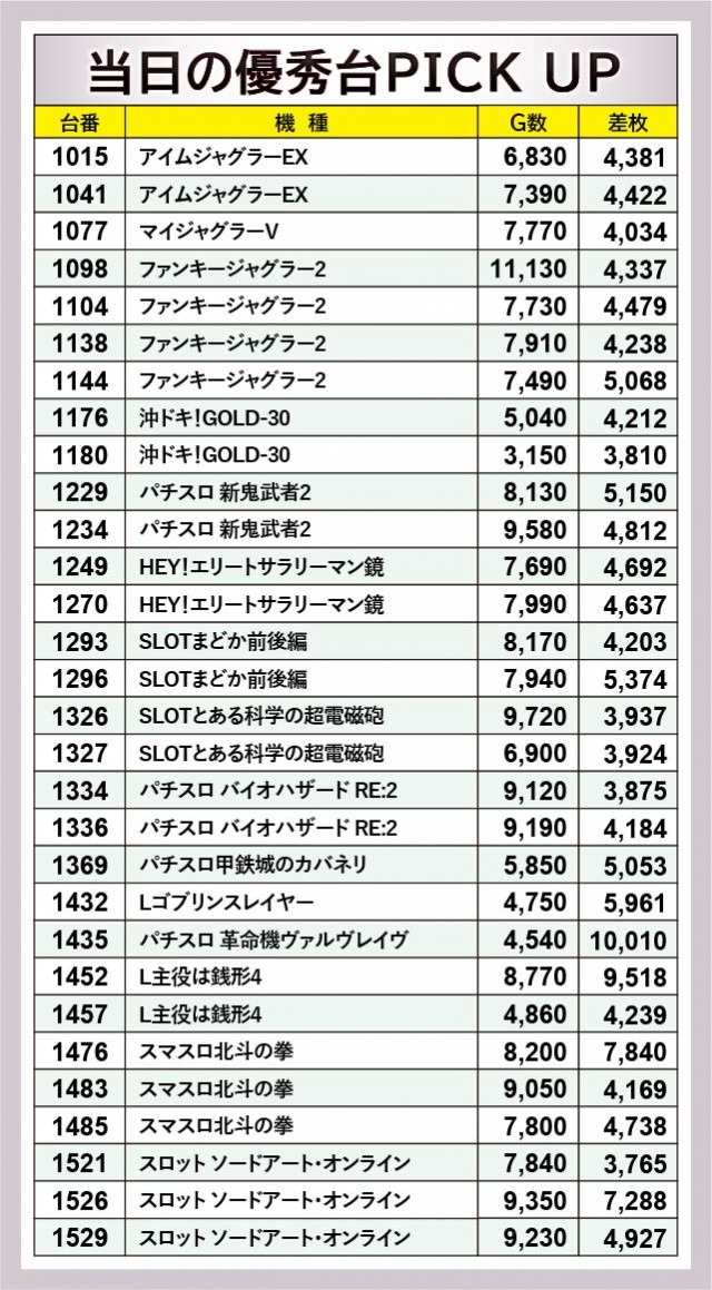 『パチスロ 革命機ヴァルヴレイヴ』1435番台+10,010枚という輝かしい記録が打ち立てられれば、『ファンキージャグラー2』1098番台11,130Gという明らかな好感触台が見られるなど、館内は活気と熱気に満ちた一日となった。特に熱量の面は突出した台が多くなっており、『L主役は銭形4』1452番台+9,518枚や『スマスロ北斗の拳』1476番台+7,840枚、『スロット ソードアート・オンライン』1526番台+7,288枚などの盛り上がりが目に焼きつくばかりだ。
