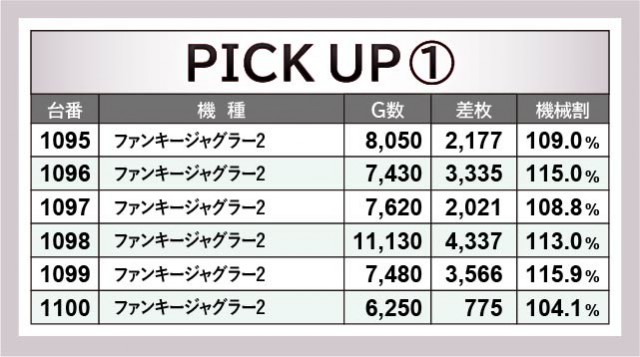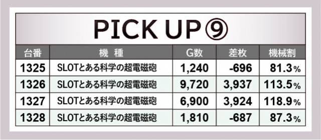 『SLOT劇場版 魔法少女まどか☆マギカ[前編]始まりの物語/[後編]永遠の物語』1293番台+4,203枚・1296番台+5,374枚、『SLOTとある科学の超電磁砲』1326番台+3,937枚・1327番台+3,924枚といった記録から、両機種もまた充実した時間を過ごせたエリアと言える。1/2でプラス差枚を達成している点からも、ファンはしっかりと状況を把握しながら、レバーを叩けたのではないだろうか。