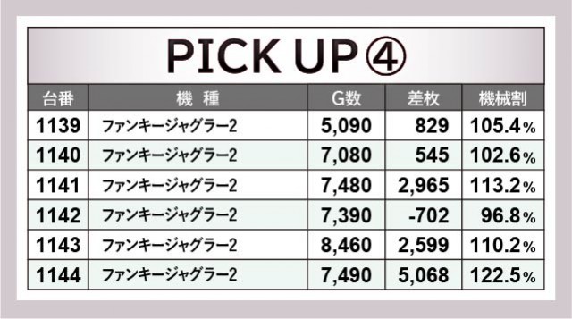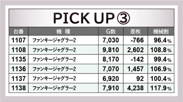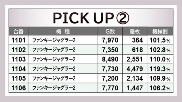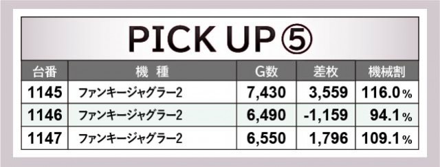 『ファンキージャグラー2』全27台はいずれも朝からじっくりと打ち込まれ、さらにはコンスタントなボーナス当選が窺える結果となった。前述したように万回転OVERが発生するばかりか、4~5千枚OVERが複数発生する盛り上がりを披露。遊技していたファン各々は明らかな好感触を感じ取り、自信をもってレバーを叩いていたのは間違いない。