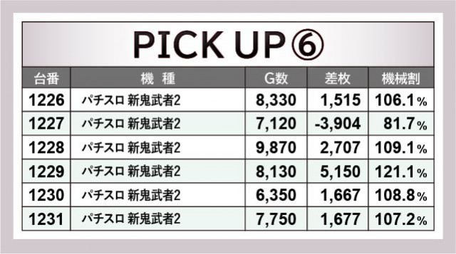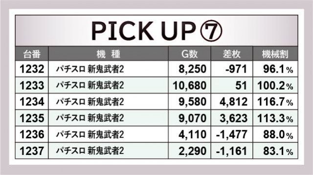 『パチスロ 新鬼武者2』全12台もまた、同様に終日を通して遊技されていた機種である。1229番台+5,150枚や1234番台+4,812枚だけでなく、1233番台は万回転OVERを達成している事実から、やはり好感触を得られたのは確かだろう。こちらでもファンの満足度は高く、有意義な時間を過ごせたに違いない。