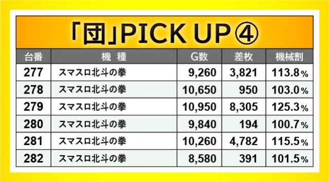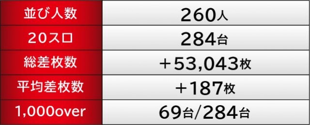 人気機種である『マイジャグラーⅤ』からも、185番台+4,622枚という熱気が放たれていた。何よりも驚きなのは4台の万回転OVER台が生まれている点で、ファンが朝から閉店までしっかりと打ち倒した様子がハッキリと分かる。それは『スマスロ北斗の拳』も同様で、こちらでは3台の万回転OVER台が発生。特に279番台は+8,305枚という凄まじい熱気を放ち、島の盛り上がりを牽引した存在だったと言えるだろう。