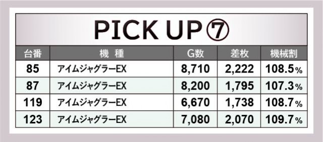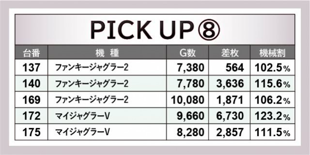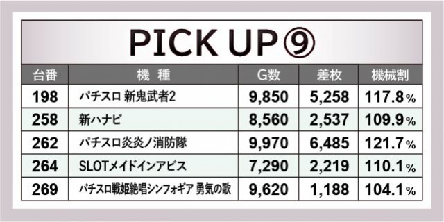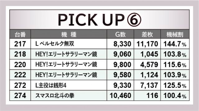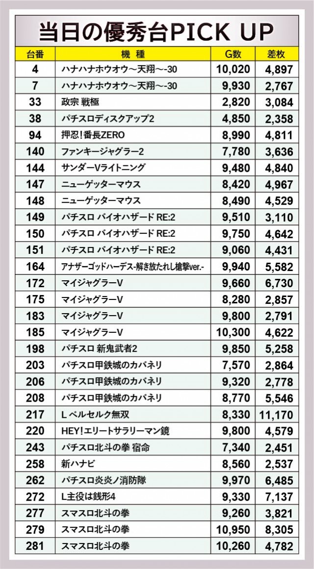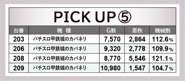 横並び好況スポット以外にも、各機種にチャンスが眠っていたようだ。『パチスロ甲鉄城のカバネリ』208番台+5,546枚や『L ベルセルク無双』217番台+11,170枚、『L主役は銭形4』272番台+7,137枚など、大きなプラスを築く台が多くみられ、これには遊技していたファンも大満足だったことだろう。