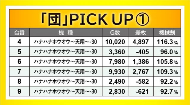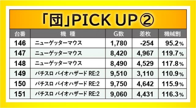 4~9番台・146~151番台・180~185番台・277~282番台は、いずれも6台横並び好況スポットを形成していた。その中でしっかりと大きな熱量を確認でき、『ハナハナホウオウ~天翔~-30』4番台+4,897枚や『ニューゲッターマウス』147番台+4,967枚・148番台+4,529枚、『パチスロ バイオハザード RE:2』150番台+4,642枚・151番台+4,431枚といった記録が生まれている。