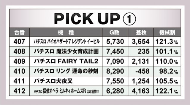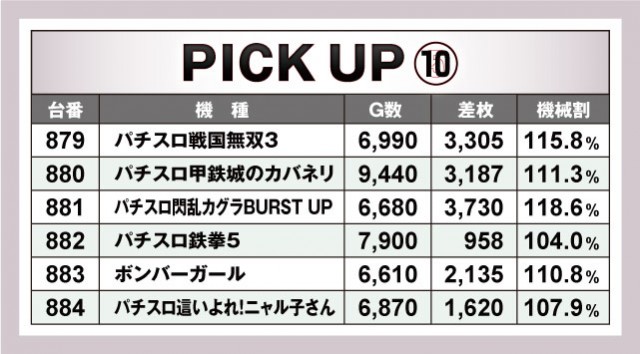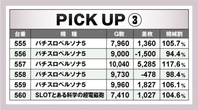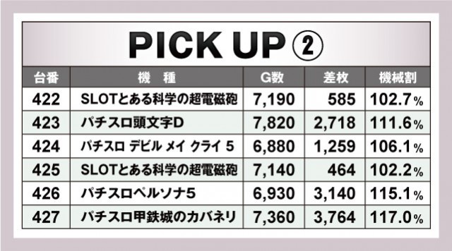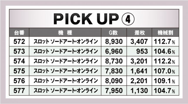 今回のピックアップはなんと計10か所。大枠で分けると、ピックアップ①、②、⑩はバラエティの並び。それ以外は機種での並びとなっている。注目はピックアップ④の『スロット ソードアート・オンライン』だろう。6台並んでのプラス差枚数は優秀。しかもバッチリほぼ終日稼働となっていたので、打ち手は早めに気づいたのではないだろうか。また、ピックアップ⑩のバラエティも6台並んでのプラス。こういう箇所があるのが『埼玉県某店』の強みではないだろうか。