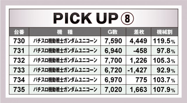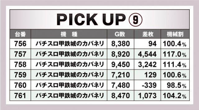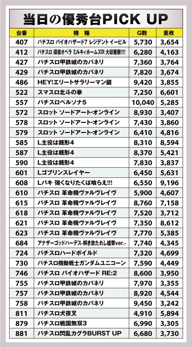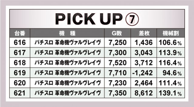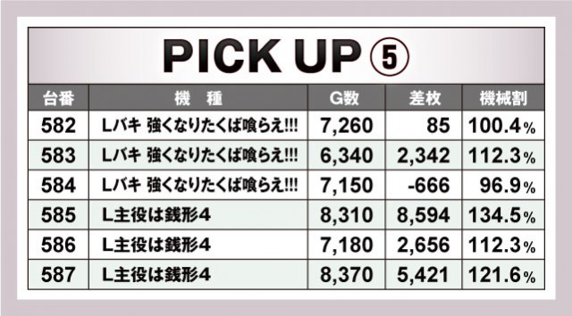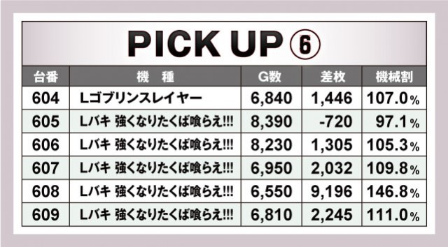 さて、まずは今回の優秀台をご覧いただくとしよう。上表に掲載されている機種は全て+3000枚オーバーとなっており…まさに圧巻!! 機種はスマスロや6.5号機のAT機が中心だ。『Lバキ 強くなりたくば喰らえ!!!』の608番台を筆頭に『パチスロ 革命機ヴァルヴレイヴ』の621番台、『L主役は銭形4』の585番台など、スマスロが差枚数の上位を占めている。その他、詳細はピックアップをご覧あれ!