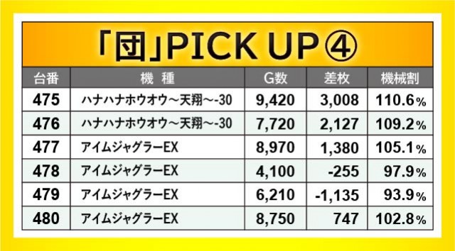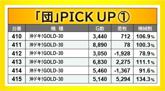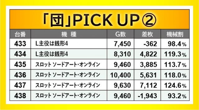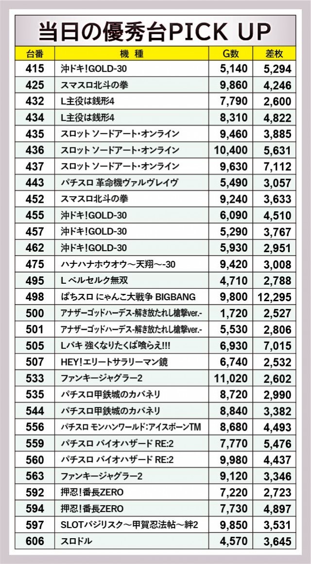 ほぼ毎回顔を出している『沖ドキ!GOLD-30』は、各所でしっかりと活躍した様子が見られる。415番台+5,294枚や455番台+4,510枚など、回転数と差枚数が比例する展開には好感を覚えずにはいられない。また特筆すべきは、『スロット ソードアート・オンライン』全4台が活躍していたことだろう。残念ながら全台プラス差枚とはならなかったが、437番台+7,112枚を筆頭に盛り上がっていたため、ファンも笑顔になれたはずだ。