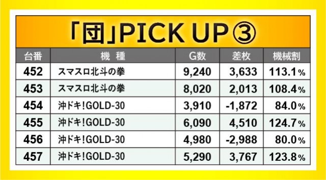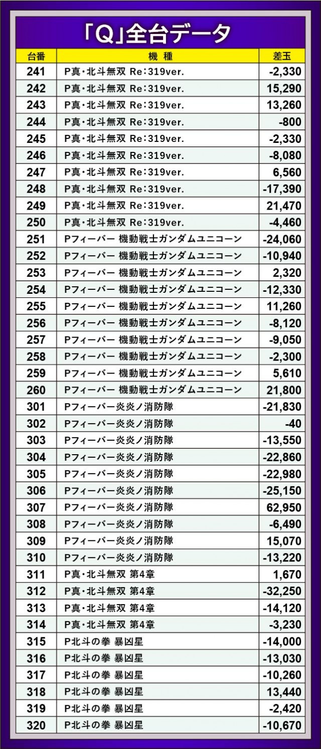 『Pフィーバー炎炎ノ消防隊』307番台+62,950玉という凄まじい熱気を放ち、島の盛り上がりを牽引する存在になっていたのは間違いない。これに続いたのが『P真・北斗無双 Re:319ver.』249番台+21,470玉や『Pフィーバー 機動戦士ガンダムユニコーン』260番台+21,800玉で、名機らしい活躍を確認できたのが嬉しいところだ。大きなマイナスを築いた台こそあるが、それでもファン諸氏が時間を忘れて遊技できたのは間違いない。