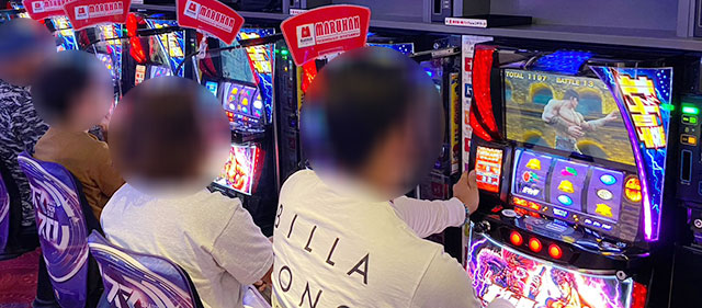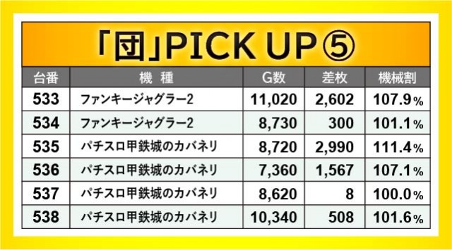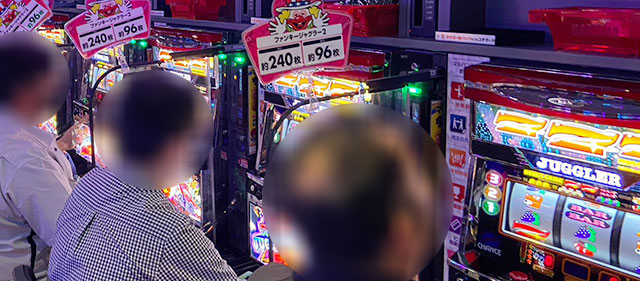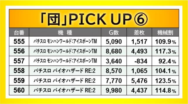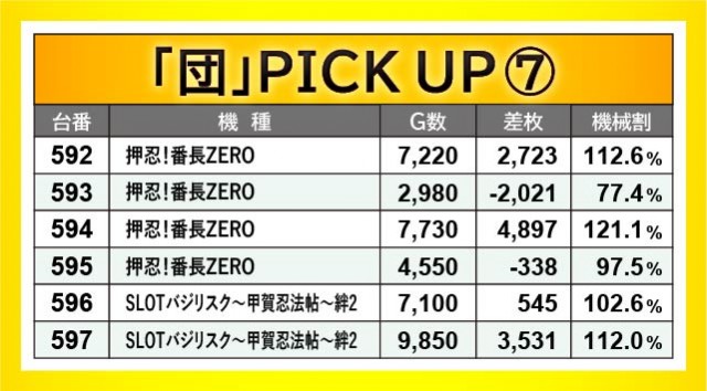 『ファンキージャグラー2』『パチスロ甲鉄城のカバネリ』で構成された、533~538番台の横並びの好況スポットは全台プラス差枚を達成。両台とも終日打ち込まれており、その中で万回転OVERを達成している点から、相当な手応えを感じていたはずだ。ほかにも『パチスロ モンスターハンターワールド:アイスボーンTM』556番台+4,493枚や『パチスロ バイオハザード RE:2』559番台+5,476枚、『押忍!番長ZERO』594番台+4,897枚など、大きな熱量を確認でき、これまたファンの満足度が高かったことだろう。
