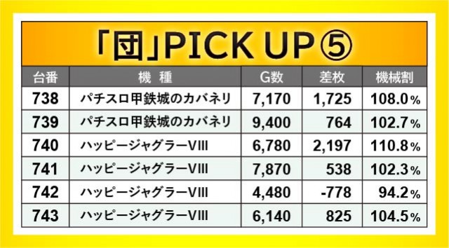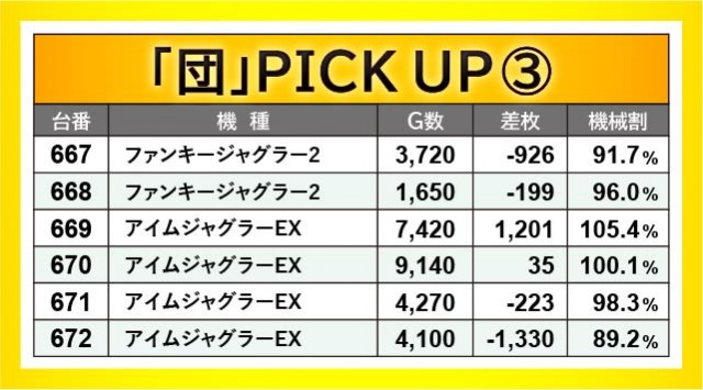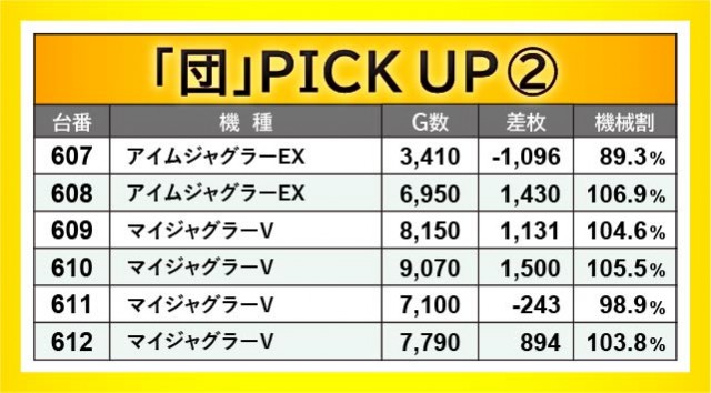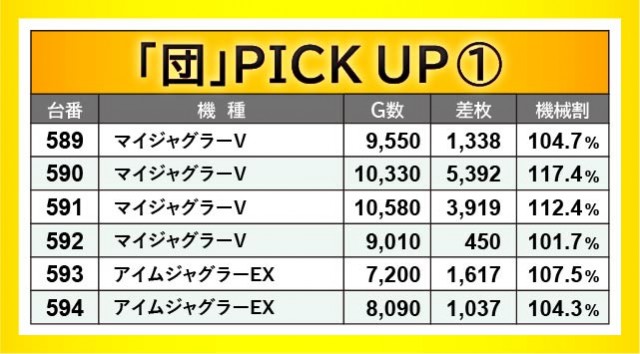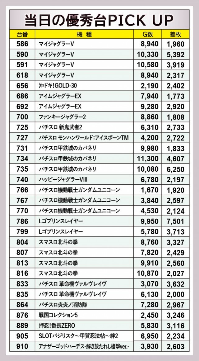 『マイジャグラーⅤ』は万回転OVERが発生するなど、シリーズ機のなかでも牽引する存在となっていた。590番台+5,392枚や591番台+3,919枚など、これら並びで熱気を放つ様子もあって、遊技していたファンは自信を持ってレバーを叩けたのではないだろうか。