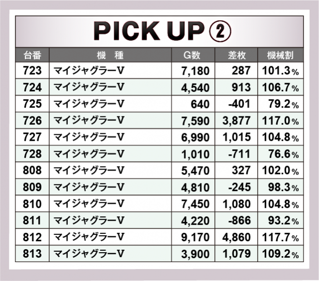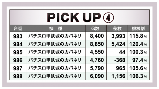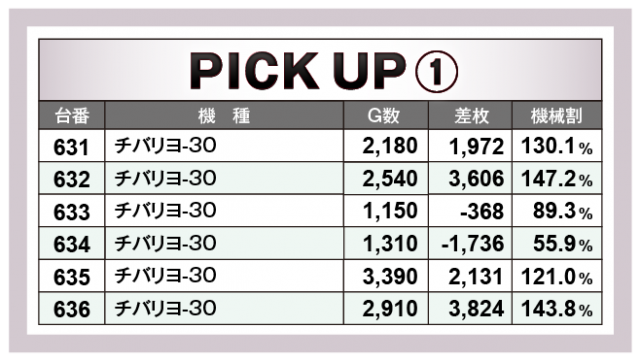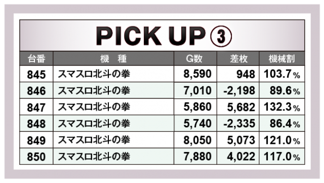 続いては、横並び好況スポットをチェック。『チバリヨ-30』『マイジャグラーV』『スマスロ北斗の拳』『パチスロ甲鉄城のカバネリ』の4機種5箇所から6台並びの好データを確認できた。全台が絶好調とはいかないものの、人気機種のポテンシャルの高さから、どの機種も楽しめる環境が整っていたことが窺えた。