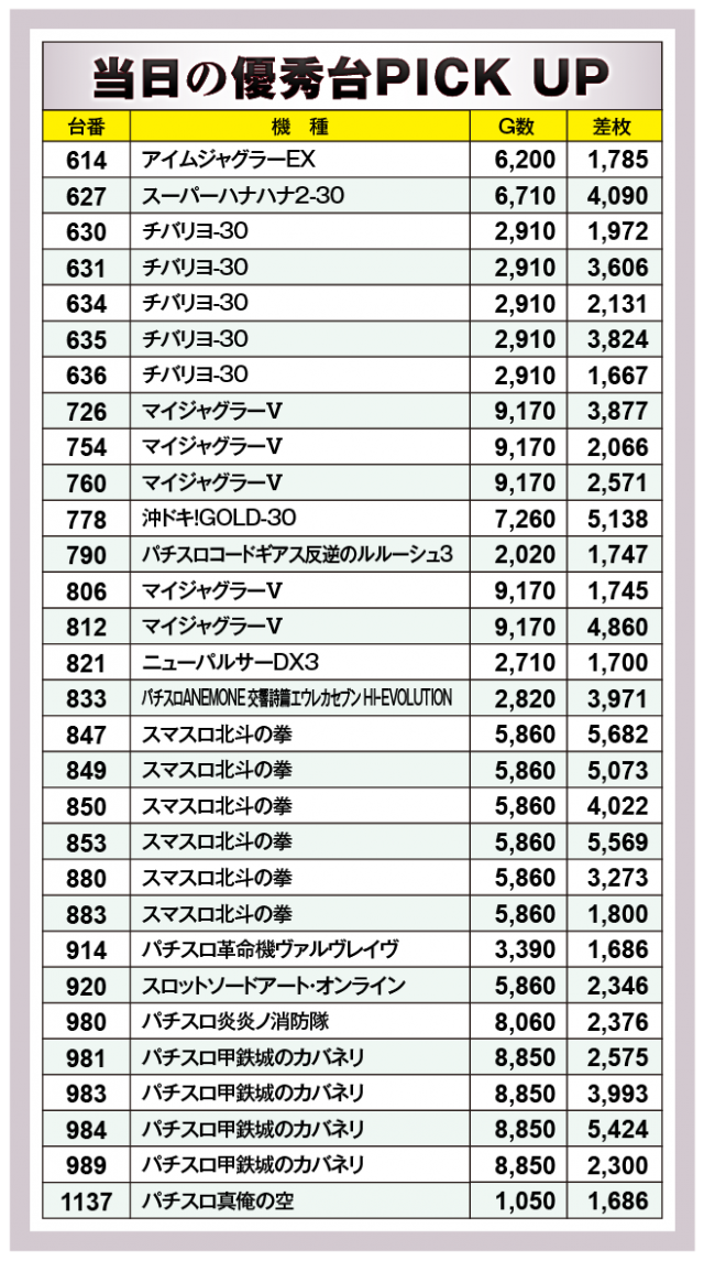 まずは優秀30台PICK UPから。30台のうち21台が差枚数+2千枚以上を達成、+3千枚オーバーは14台、+4千枚オーバーは8台となった。後述する好調機種以外では、778番台の『沖ドキ!GOLD-30』で+5,138枚を獲得!次いで、627番台の『スーパーハナハナ2-30』で+4,090枚、さらに833番台の『パチスロANEMONE 交響詩篇エウレカセブン HIーEVOLUTION』で+3,971枚をマークし、様々な機種の活躍が目立っていた。