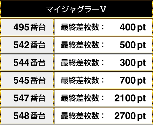 『マイジャグラーⅤ』は設置されている16台のうち6台がプラスptを記録し、2台が2000ptを上回った。