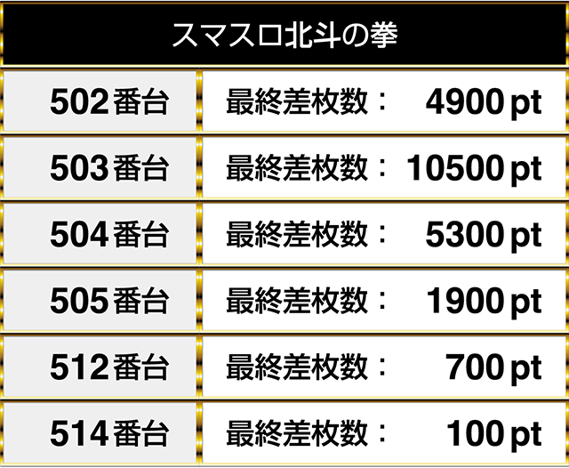閉店時には6台がプラスptを記録し、10500ptや5300ptを記録する台もあった。