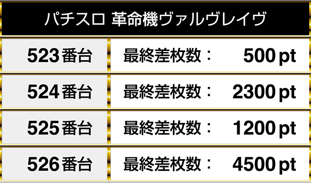 『パチスロ 革命機ヴァルヴレイヴ』のプラスptの割合は5割以上で、526番台が4500pt!!