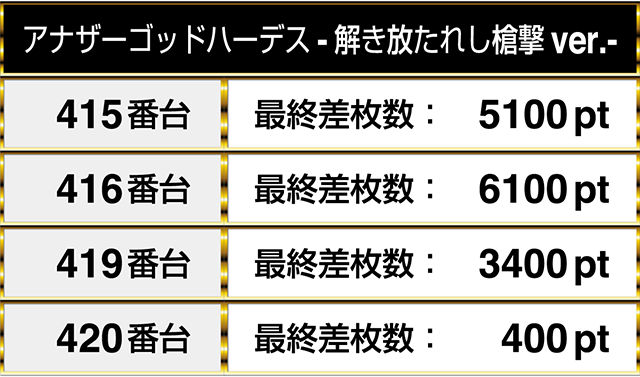 『アナザーゴッドハーデス-解き放たれし槍撃ver.-』は6台中4台がプラスptとなり、1台が6000ptオーバー!