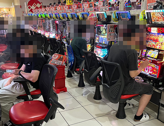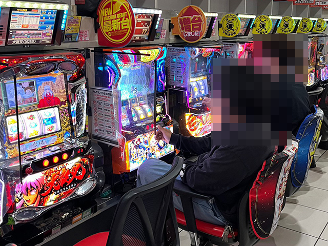 380番台の「SLOTメイドインアビス」と381番台の「パチスロ甲鉄城のカバネリ」で遊技を楽しんでいるプレイヤーの存在感があった。