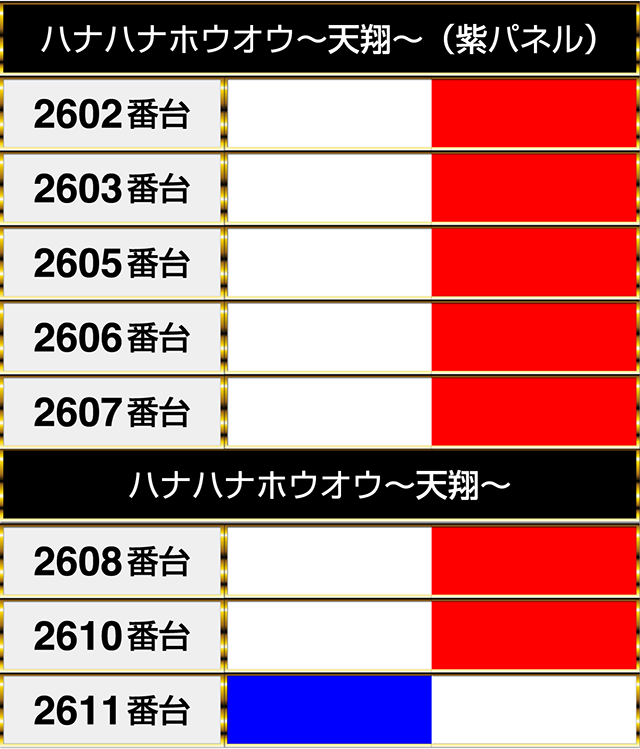 『ハナハナホウオウ~天翔~(紫パネル)』の2602番台から『ハナハナホウオウ~天翔~』の2610番台までが並んでプラスpt!!