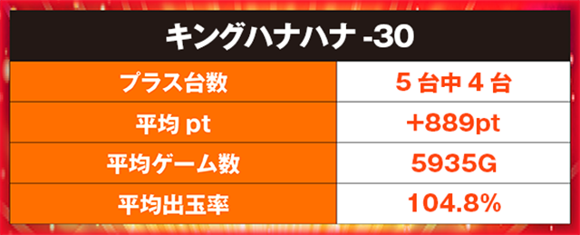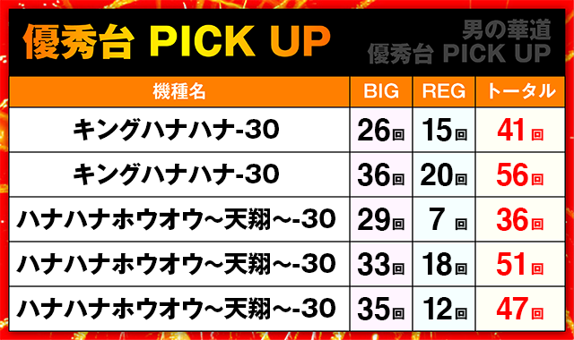「キングハナハナ-30」と「ハナハナホウオウ~天翔~-30」のどちらにも、ボーナス回数が50回を超えている台があった。