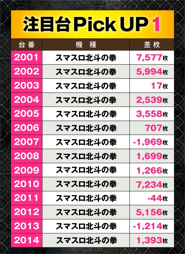 なかでも注目を集めていたのは『スマスロ北斗の拳』。なんと14台が連続の並びとなっていたのだ!5,000枚オーバーの優秀台も多数出現している。