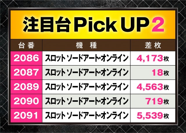 さらには 『スロット ソードアート・オンライン』でも好調台を確認!4,000枚オーバーの台が3台あるだけでなく、全ての台がプラスと素晴らしい結果になっていた。