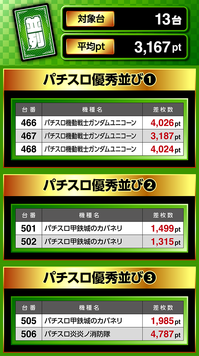 3台設置の「パチスロ機動戦士ガンダムユニコーン」に4,026pt、3,187pt、4,024ptが並んだ。