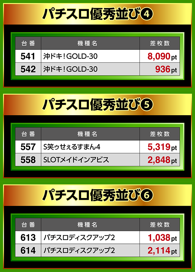 541番台と542番台の「沖ドキ!GOLD-30」もプラスとなり、541番台は8,090pt。