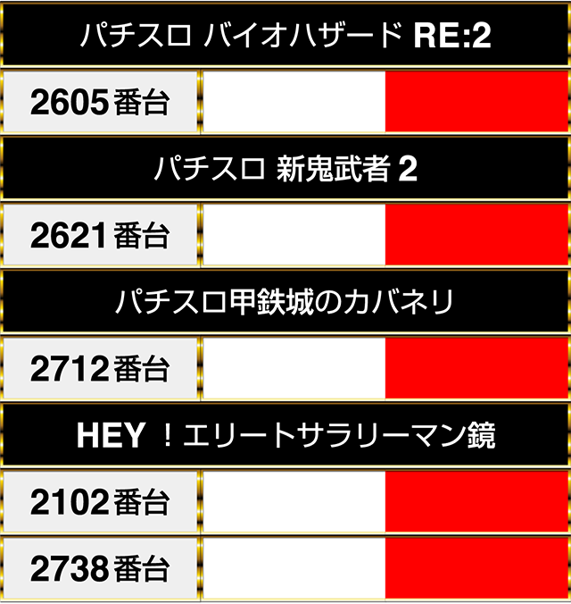 『パチスロ バイオハザード RE:2』の2605番台や『パチスロ甲鉄城のカバネリ』の2712番台などもプラスptでこの日を終えた。