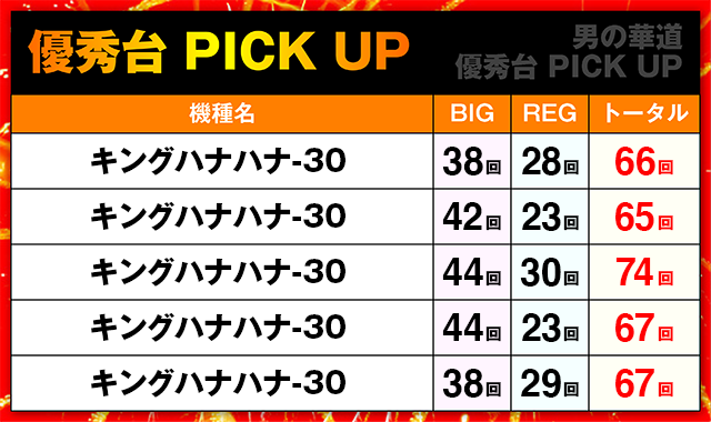 BIGとREGの回数がともに30回を超え、トータルで74回を記録した台もあった。