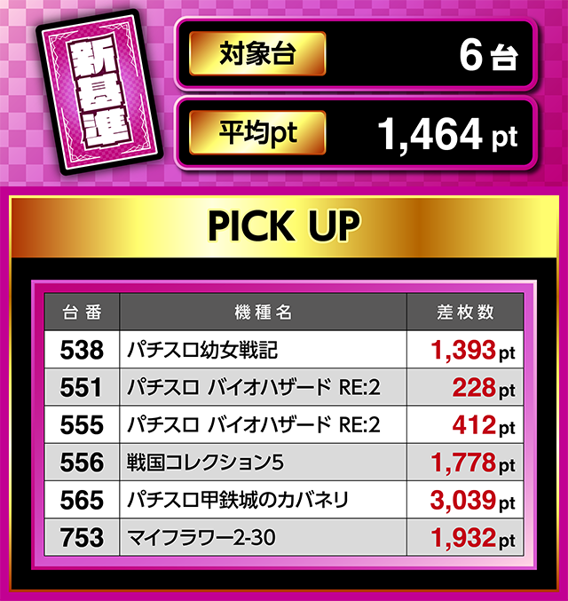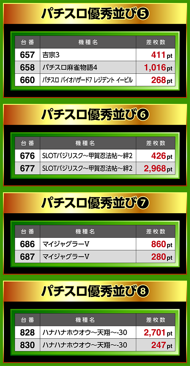 657番台の「吉宗3」から660番台の「パチスロ バイオハザード7 レジデント イービル」までは、3台連続でプラスを記録した。