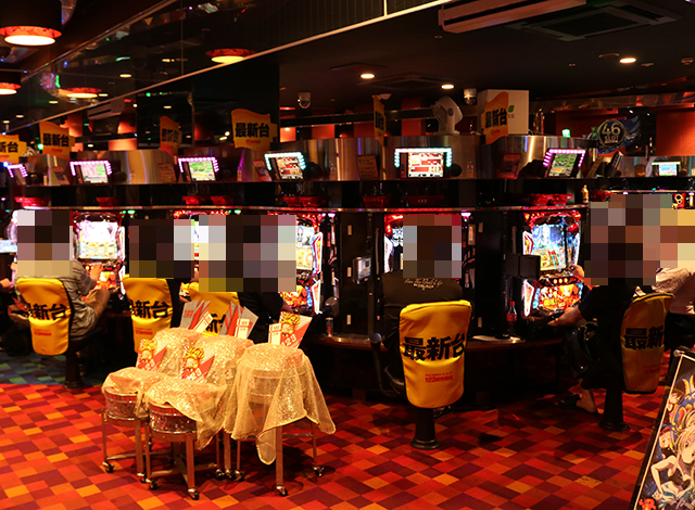 夕方頃にパチスロコーナーをまわっていくと、新台や長く愛されている機種など、随所に華やかな光景が広がっていた。