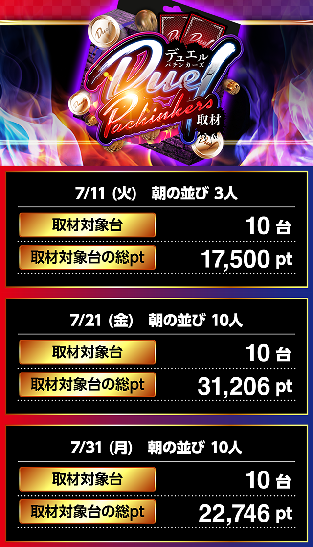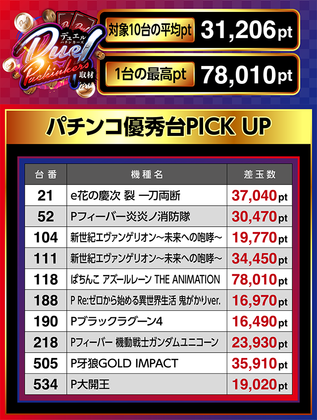21番台の「e花の慶次 裂 一刀両断」や52番台の「Pフィーバー炎炎ノ消防隊」、505番台「P牙狼GOLD IMPACT」なども30,000ptオーバー。
