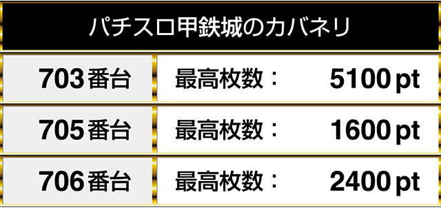 『パチスロ甲鉄城のカバネリ』の703番台から706番台までが並んで1000ptオーバー!