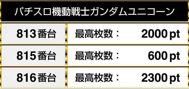 『パチスロ機動戦士ガンダムユニコーン』も3台にプラスptが並び、2台が2000pt以上となった。