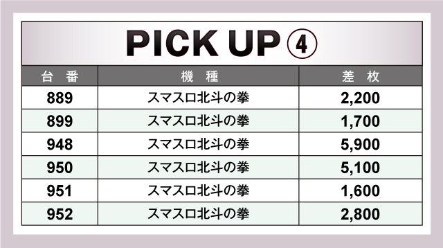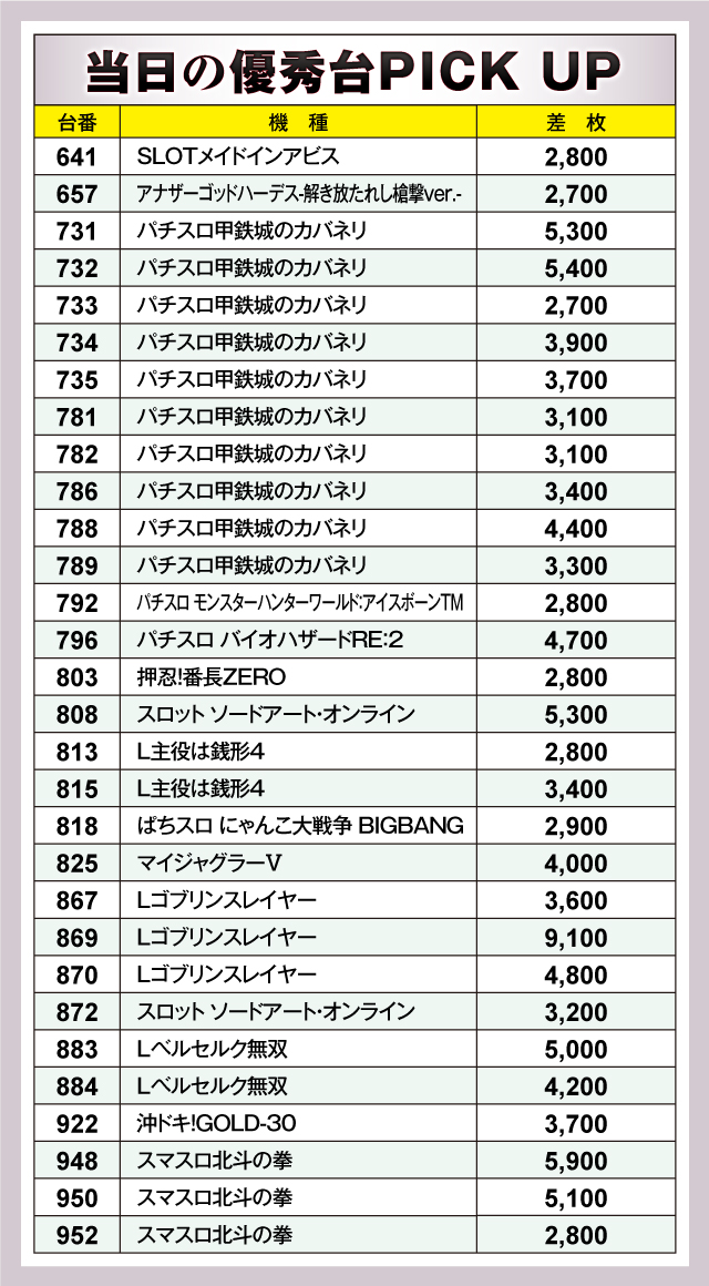 優秀台としてまずあげたいのが+9,100枚を記録した『Lゴブリンスレイヤー』の869番台。同機種は870番台が+4,800枚、867番台が+3,600枚をマークしており、あらためてその実力をアピールしている。それに続いたのが『スマスロ北斗の拳』。958番台が+5,900枚、950番台が+5,100枚を記録しており、名機の後継としての地位をしっかりキープしている。そして勢いという点で最も注目されている『パチスロ甲鉄城のカバネリ』も負けてはいない。+5,400枚の732番台を筆頭に、731番台が+5,300枚、788番台が+4,400枚と優秀台がズラリ。当分、人気は続きそうだ。以下、+5,000枚の『Lベルセルク無双』883番台、+5,700枚の『パチスロ バイオハザード RE:2』796番台と続いた。