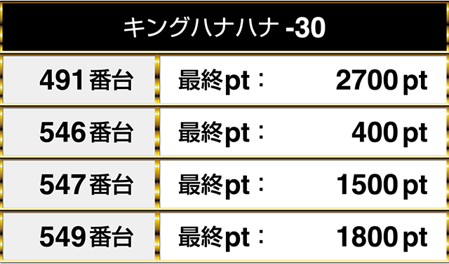最終的には『キングハナハナ-30』の4台がプラスptを記録し、3台が1000ptオーバー!
