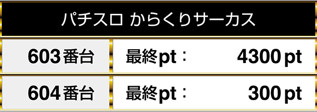 『パチスロ からくりサーカス』は設置されている2台の両方がプラスptとなり、603番台は4300ptを記録した。