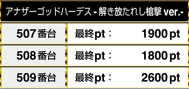 4台設置の『アナザーゴッドハーデス-解き放たれし槍撃ver.-』は3台が1000ptを上回った。