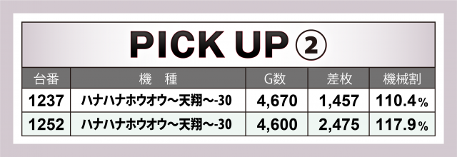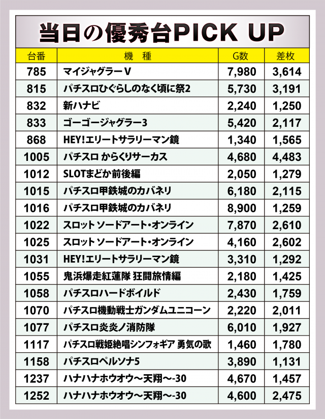 まずは優秀20台のPICK UPからチェック。当取材では上位30台に迫るのが定例なのだが、それに10台も及ばなかった点は非常に残念だ。20台のうち半数弱の9台が差枚数+2千枚以上を達成、+3千枚以上は3台となった。